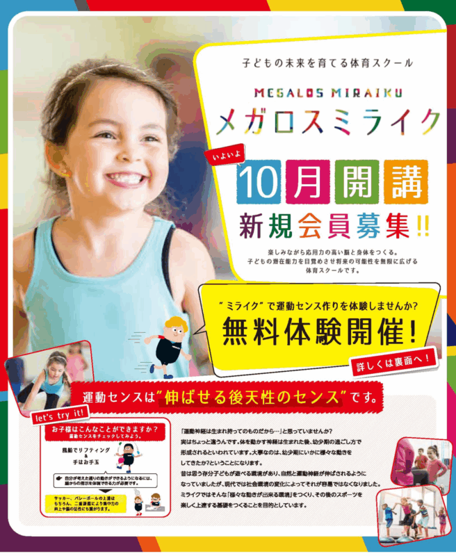 メガロスミライクとは、様々な動きを通じてお子様のバランス能力・柔軟性・瞬発力・イメージ力・判断力の発達を促し、運動センスを磨くプログラムです。
