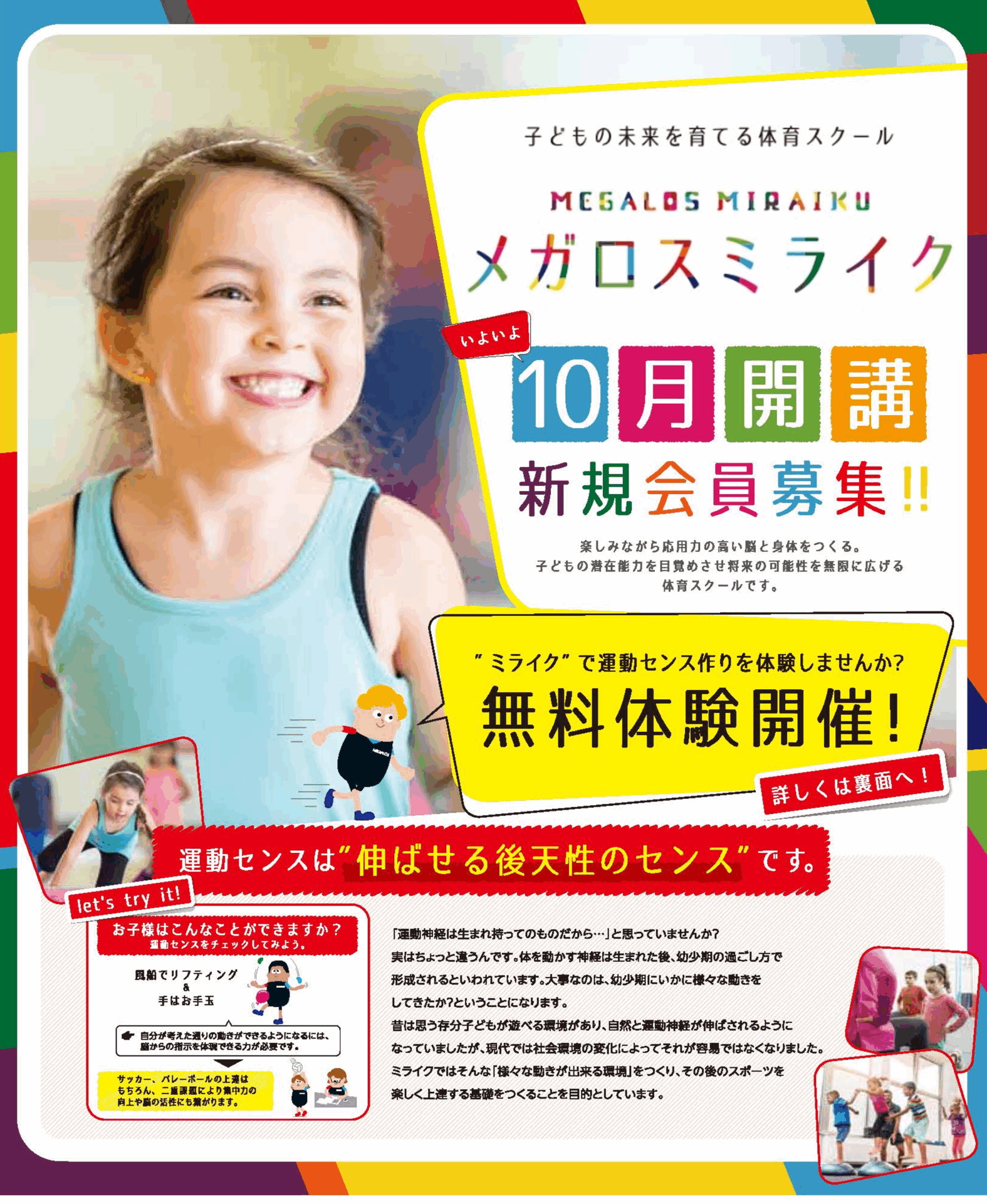メガロスミライクとは、様々な動きを通じてお子様のバランス能力・柔軟性・瞬発力・イメージ力・判断力の発達を促し、運動センスを磨くプログラムです。