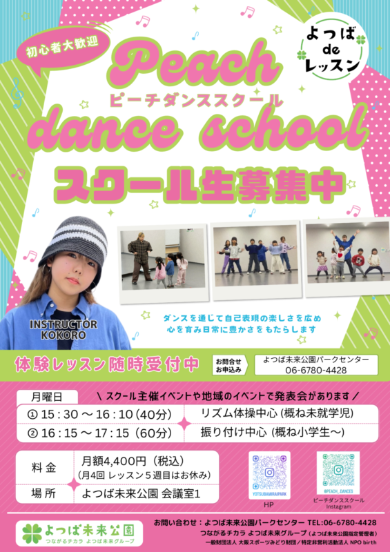 | 開催時間 | リズム体操クラス(未就学児向け) 15:30~16:10 ダンス振付レッスンクラス(小学生向け) 16:15~17:15 |